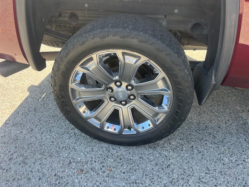 2016 GMC Sierra 1500 Denali in Crimson Red Tintcoat with Cocoa/Dune leather interior. Powered by the EcoTec3 5.3L V8 (355 hp, 383 lb-ft) and an automatic transmission. Factory-equipped Denali features include premium leather seating with heated and ventilated front seats and driver memory, heated steering wheel, power-adjustable seats, dual-zone automatic climate control, GMC IntelliLink touchscreen with navigation, Bluetooth and USB inputs, Bose premium audio, rearview camera and parking assist, chrome Denali exterior trim with projector headlights and LED signature lighting, fog lamps, power-folding heated mirrors, keyless access with push-button start, OnStar connectivity, and full airbag/stability/traction control systems. Below 99,000 miles (avg. under 9,000 miles/year) and in excellent overall condition.